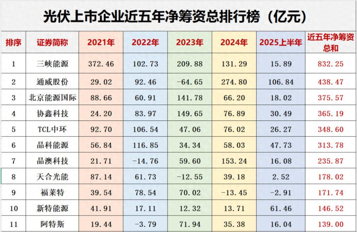 从企业排名看,四年半时间累计净筹资最多的10大企业依次为三峡能源、通威股份、北京能源国际、协鑫科技、TCL中环、晶科能源、晶澳科技、天合光能、福莱特和新特能源,累计净筹资超100亿的企业有15家;与之相反,经筹资为“负”的企业有33家,其中正泰电器四年半净筹资合计为-92.26亿,协鑫新能源为-65亿,横店东磁为-45亿。