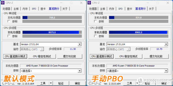 综合测试微星MPG X870E EDGE TI WIFI刀锋钛主板搭配9800x3D进行测试,可以看到开启PBO后,CPU-Z跑分从单核759/多核857提升到单核831/多核8902,总体性能提升幅度在5%左右。