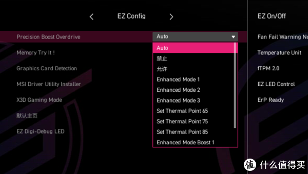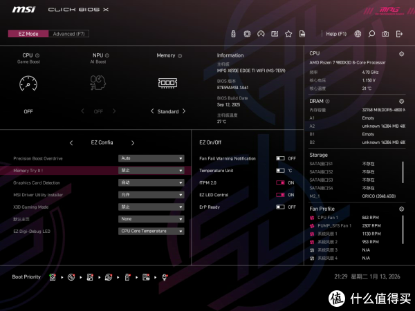 BIOS微星MPG X870E EDGE TI WIFI刀锋钛的BIOS界面条理十分清晰,EZMode界面可以快速调整CPU Game Boost、NPU AI Boost、内存EXPO、风扇模式等,大部分用户不用进高级设置即可完成常用设置。