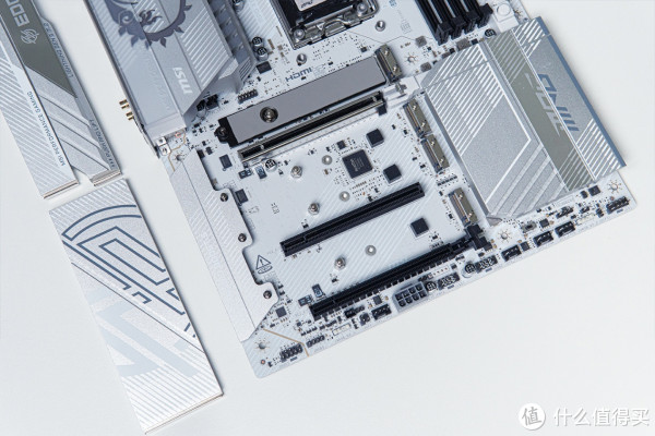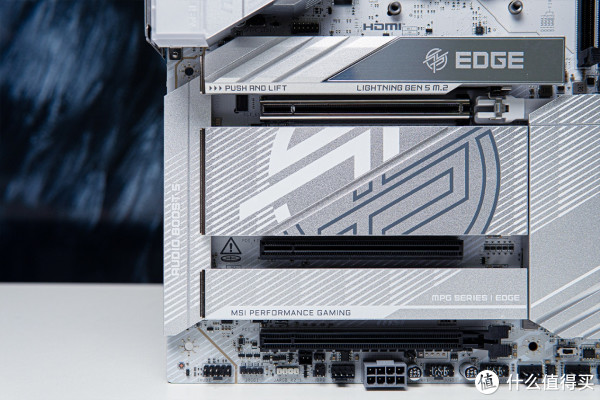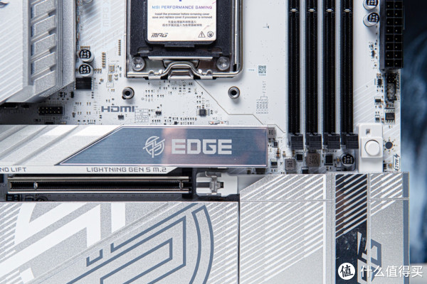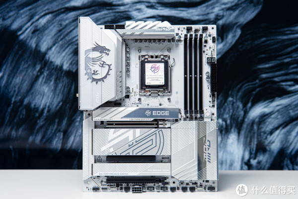 外观第一眼看到微星MPG X870E EDGE TI WIFI刀锋钛主板,首先给我的感觉就是板正,大面积白色散热装甲+白色8层PCB板,十分耐看,微星龙标辨识度拉满。