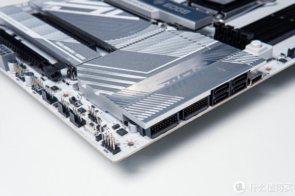 微星MPG X870E EDGE TI WIFI刀锋钛右下角的SATA接口以及JUSB接口为横向设计,同样被散热装甲覆盖,看起来十分规整,双JUSB接口可以连接更多USB端口,对于需要连接多外设的玩家来说是刚需。