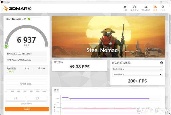 3DMARK Steel Nomad测试中,整机得分6937,显卡测试帧率为69.38,预测《战地5》2K分辨率下超200FPS。