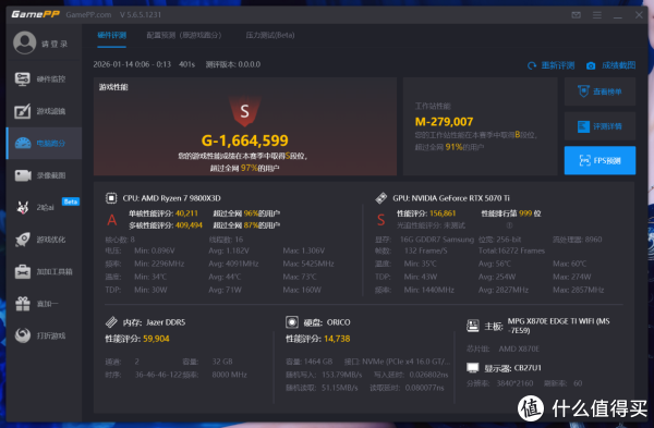 使用GamePP测试综合性能,整机游戏性能得分1664599,工作站性能得分279007,游戏性能均处于S段位,工作站性能处于B段位。