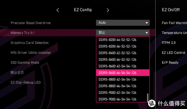 Memory Try It!是微星联合多品牌进行超频测试后,提供的多组稳定的超频预设,比如上机的海力士 Adie颗粒C26内存, 8000频就有四组预设可选,这里我选择36-46-46-122时序可直接点亮,免手动测试省时省力。