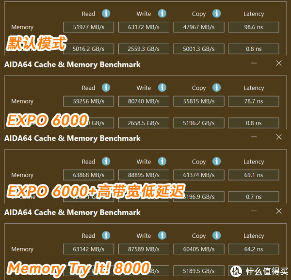 内存这边就有意思了,手头的海力士C28默认频率4800,时序40-40-40-77,开启EXPO后,读、拷贝小幅度提升,写入提升近15%,延迟从98.6ns降低到78.7ns,提升非常明显,再开启微星MPG X870E EDGE TI WIFI刀锋钛自带的Latency Killer和High-Effciency Mode以及Menory Timing Preset(逆天香),读写拷贝速率还可进一步提升8%左右,延迟降低到69.1ns,而使用Memory Try It!开启8000 36-46-46-122后,免调参可直接点亮,同步开启低延迟高带宽,读写拷贝速率小降,延迟降低到64.2,AMD还是直接AUTO好了。