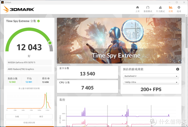 3DMARK Time Spy Extreme测试中,整机得分12043,5070Ti得分13540,CPU得分7405。