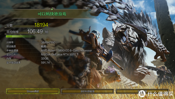 使用《怪物猎人:荒野》基准测试工具,开启帧生成后,4K分辨率极高画质,平均帧率106.49,表现也十分稳定。