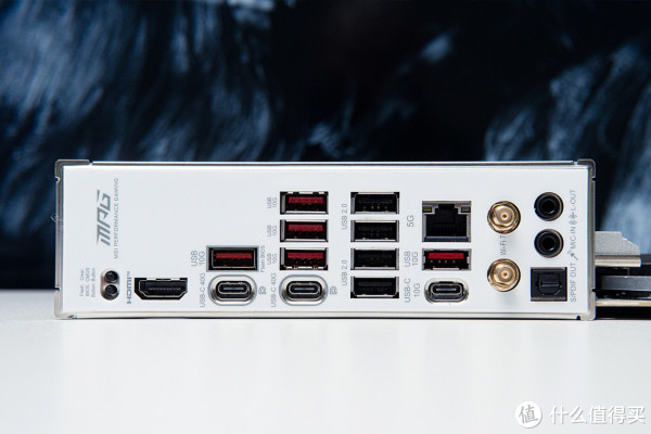 主板后置接口按键包含Clear CMOS、USB 10Gbps Type-A*5、USB 2.0*4、5Glan、HDMI、USB 40Gbps Type-C*2、USB 10Gbps Type-C*1、3.5mm音频口*2、光纤音频口,接口数量足够丰富。