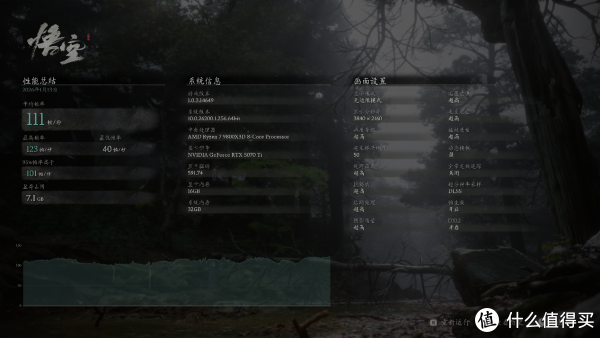 使用《黑神话:悟空》基准测试工具,默认超高画质+帧生成,超采样清晰度50,开启帧生成,4K分辨率下平均帧率111,95%帧率高于101,,9800x3D+5070Ti的游戏表现还是不错的。