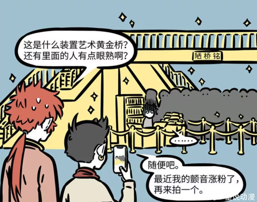 在某一天,红孩儿和哪吒出来闲逛,在某个地方发现了一座艺术黄金天桥,其名为陋桥铭(草考《陋室铭》),他们还发现了某个眼熟的人。此时哪吒已经发现天桥底下的是白泽,只是没想到他还是被人围观,不过这一次是路人。白泽面对如此局面,那是已经社死。原本就社恐的他,天天被围观,那肯定不好受。哪吒不管这些,此时还是想拍视频发网上,还能继续涨粉。