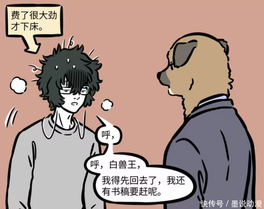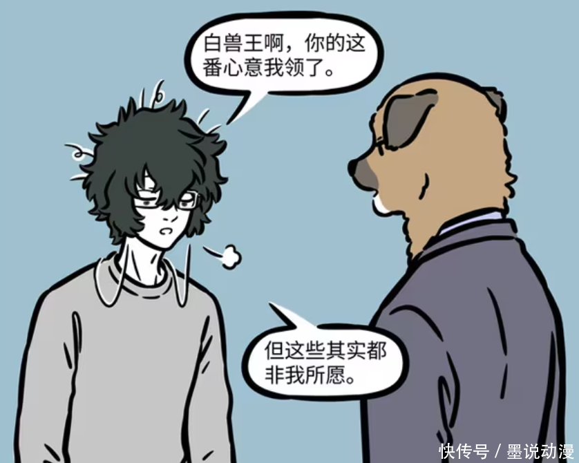 《非人哉》漫画版,白兽王报恩第二幕。白泽从大床上下来之后,白兽王还为他安排签售会。可以看出白兽王实力雄厚,不过白泽的愿望并不是这样。在说出愿望之后,白兽王帮白泽实现。哪吒和红孩儿出来逛的时候,在天桥下发现了白泽。