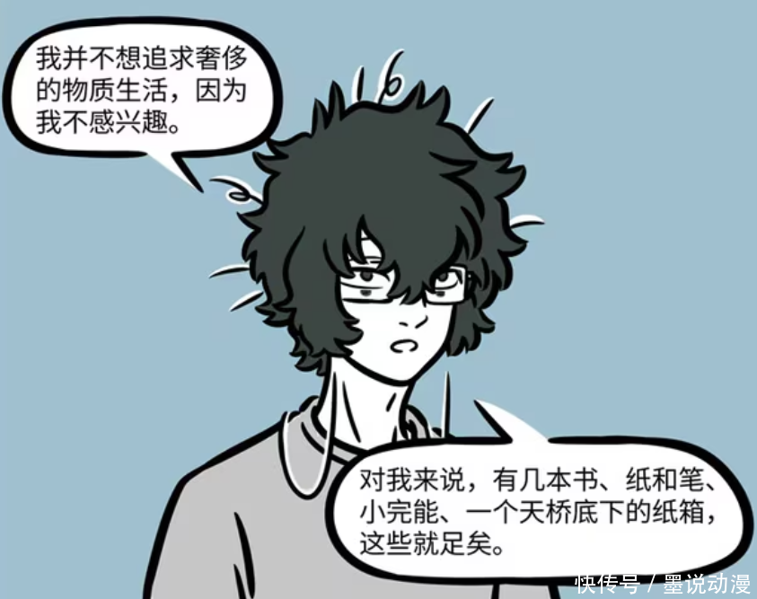 白泽告诉白兽王,他并不想追求奢侈的物质生活,因为这些他不感兴趣。如果白泽真想赚钱,以他的本领,现在不说富可敌国,起码也是富甲一方。对于白泽来说,他的愿望就是有几本书、纸和笔还有干脆面,在天桥底下有个纸箱,这样就已经足够。